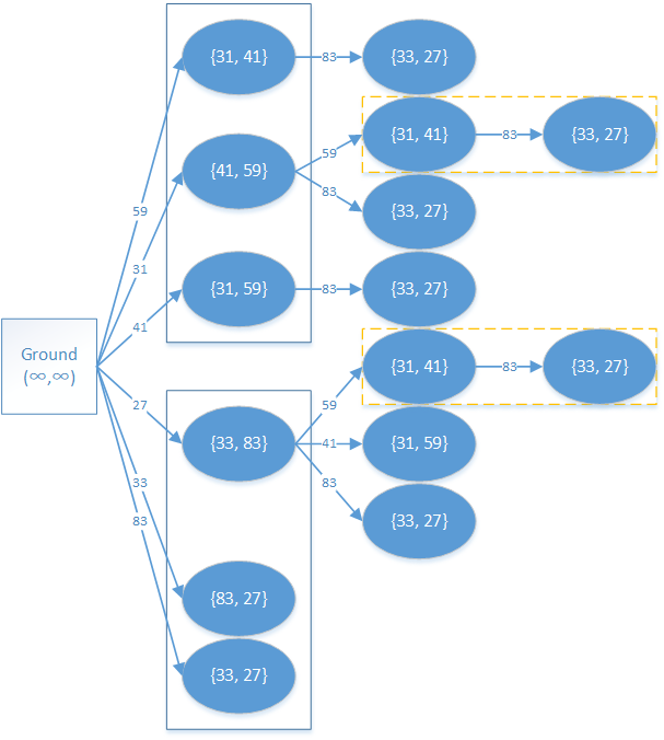 假设有两个砖块,三条边分别为 31,41,5931, 41, 5933,83,2733, 83, 27,那么整张 DAG 应该如下图所示。