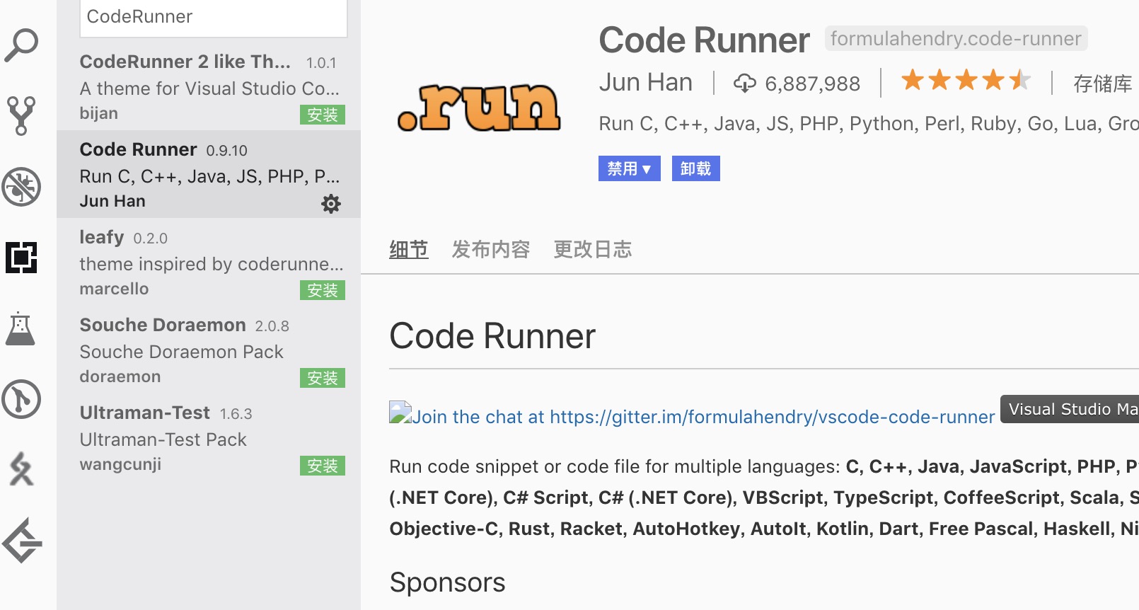 安装的方式是在扩展商店搜索 Code Runner 并点击 Install;或者前往 Marketplace 并点击 Install,浏览器会自动打开 VS Code 并进行安装。