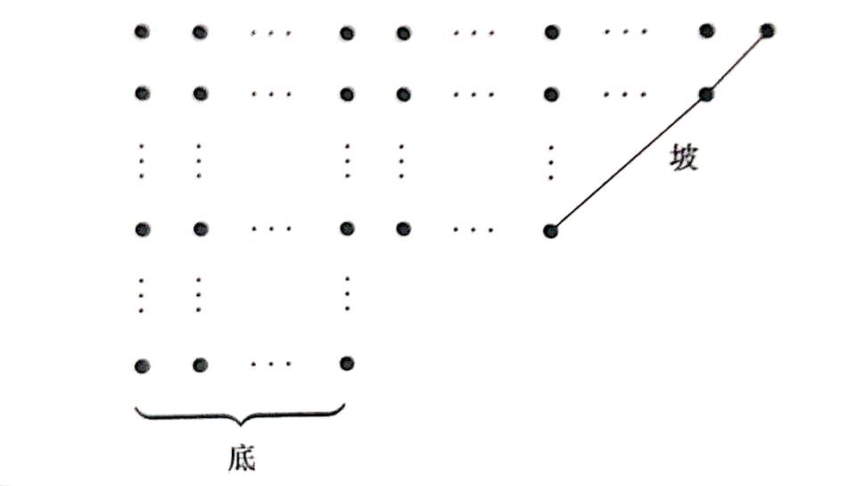 画出每个互异分拆的 Ferrers 图。最后一行称为这个图的底,底上点的个数记为 bb(Bottom);连接最上面一行的最后一个点与图中某点的最长 4545 度角线段,称为这个图的坡,坡上点的个数记为 ss(Slide)。